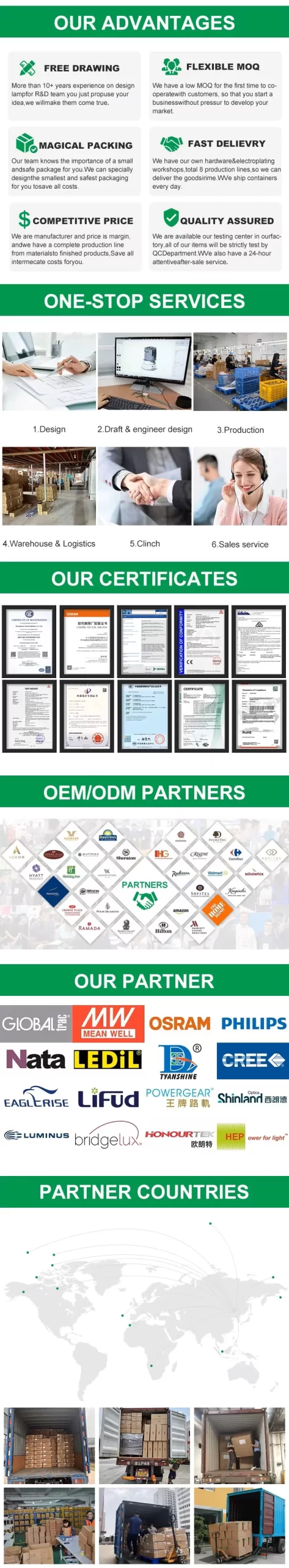 1. Светодиодные чипы высокого качества (SMD/Cob) с высокой световой эффективностью (120~180 лм/Вт), в паре с алюминиевым радиатором для быстрого отвода тепла.