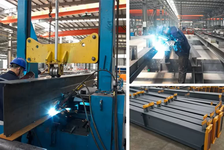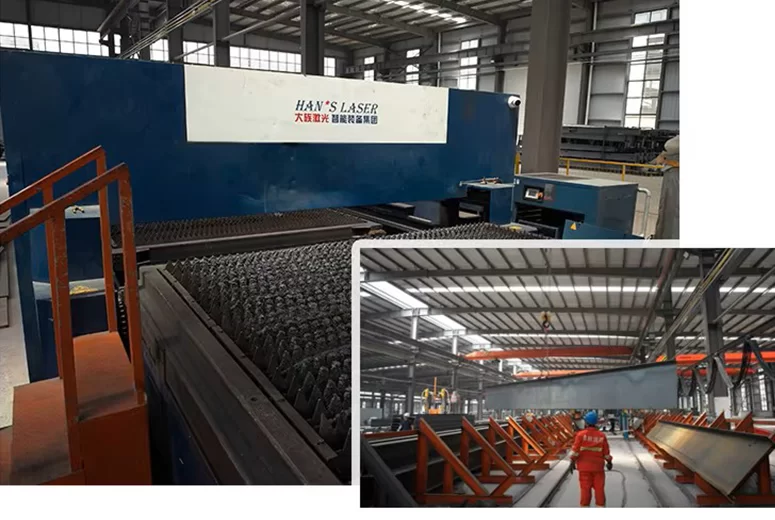 Основная конструкция включает в себя столбы и балки, изготовленные из сваренной H-образной стали стандартов Q355B/Q235B. Соединение столбов и балок осуществляется с помощью высокопрочных болтов; соединение столбов с фундаментом – с использованием встроенных анкерных болтов